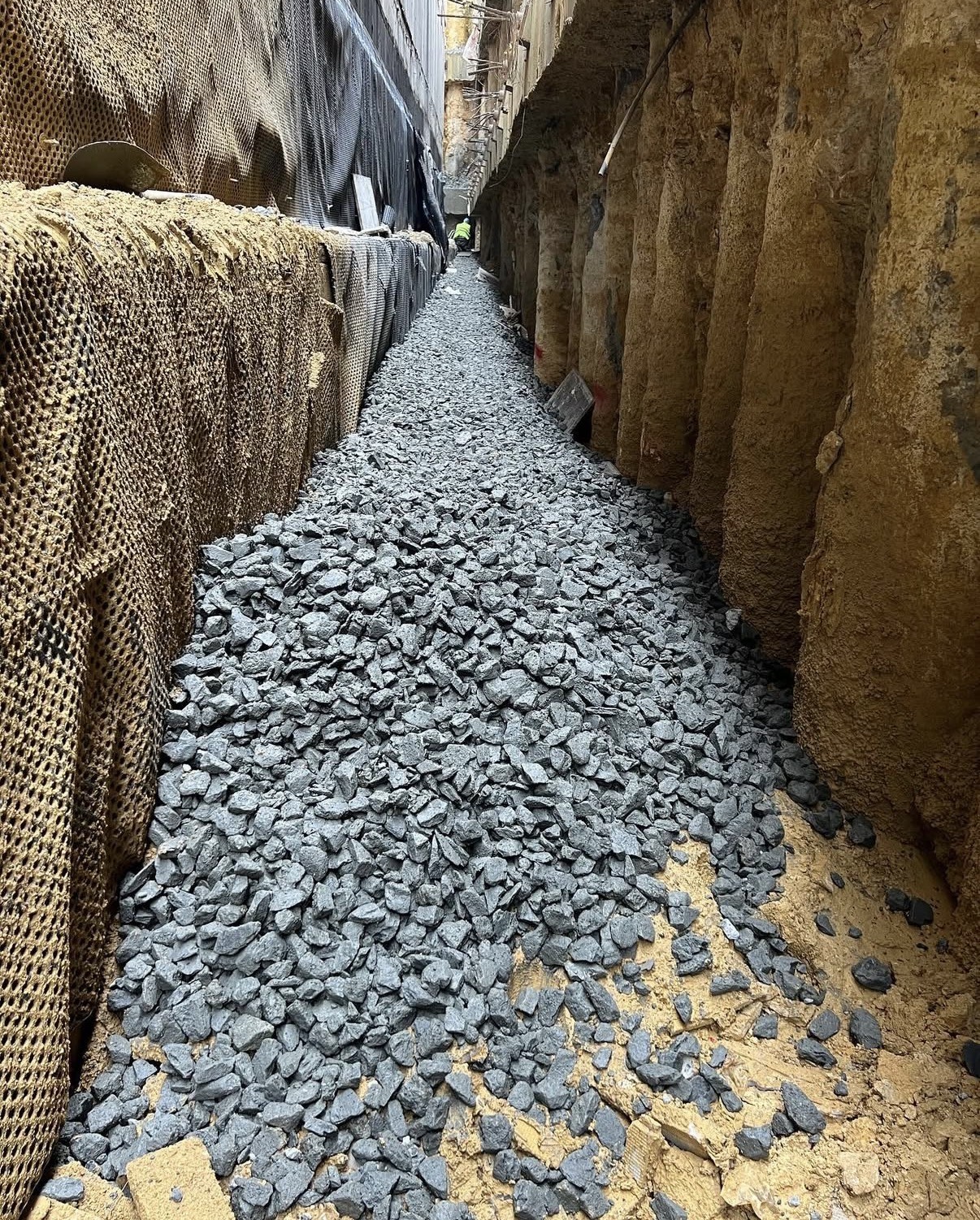 Çakıl, geotekstil ile sarılarak kapatılır.